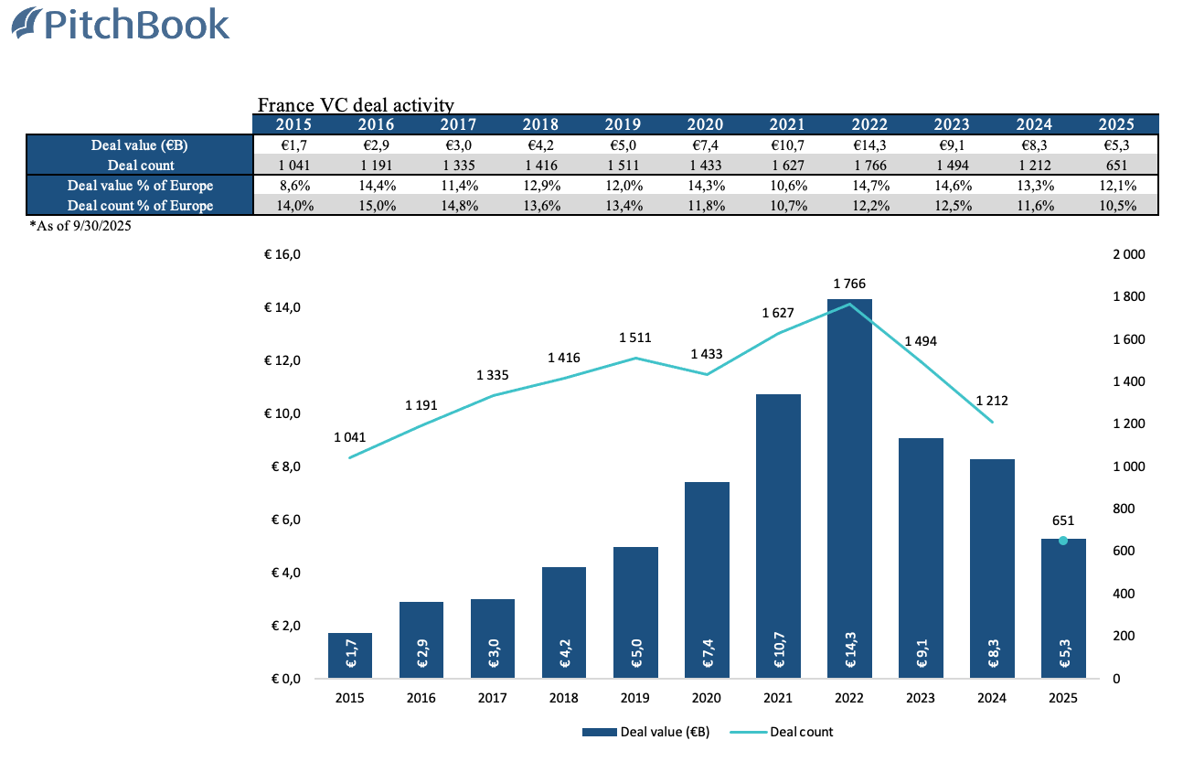 According to Pitchbook, YTD, even with Mistral, French startups have raised €5.3 billion in the first 9 months of this year against €8.3 billion for all of last year. But there have only been 651 funding rounds in 2025 compared to 1,212.