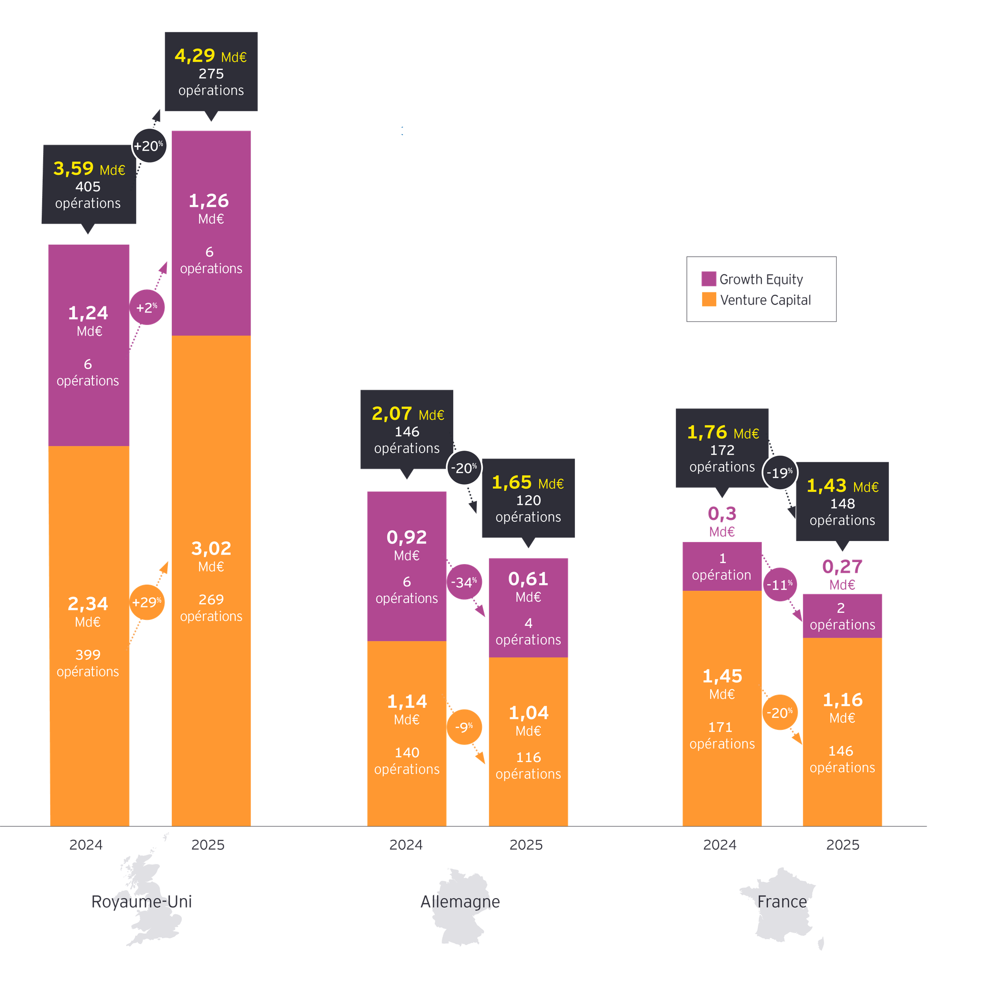 ⬇️ 📉 The latest data from EY confirmed what we reported last month: Funding for French tech startups continues to slide in Q1 2025. Only 148 companies raised €1.4 billion, a decrease in value of 19% and 14% in volume terms compared to Q1 2024. Meanwhile, the US has seen investments boom with growth of 154% thanks to its AI leaders (OpenAI, Anthropic, and Groq), and even Europe is growing at just over 10%. In the European Union, France has lost its lead to Germany, where companies raised €1.65 billion (though that country saw a 20% decline 20% in value and a 14% dip in volume).