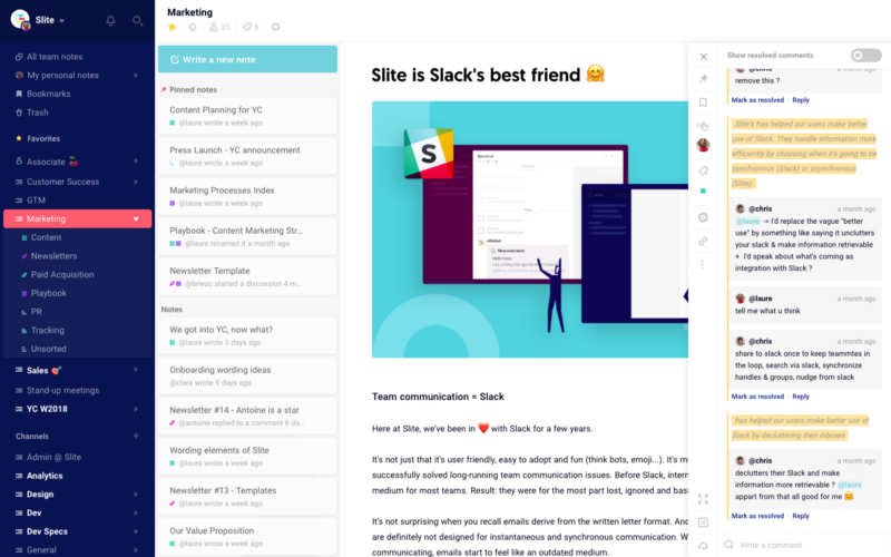 Slite has taken the fast-lane to initial success. The company built a collaboration tool that is optimized for teams in a way Pasquier believes rivals like Google Docs, Evernote, or Microsoft Word are not. That “huge mission” boils down to beating those tech giants at their own game.