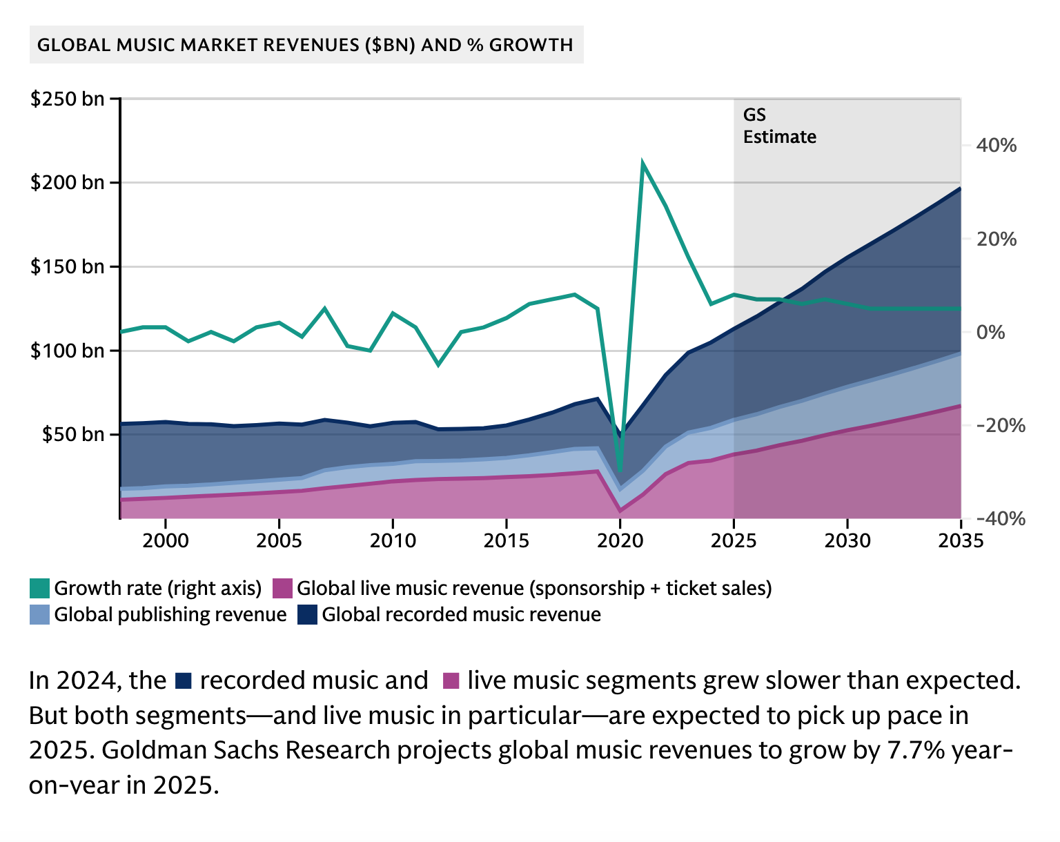 According to a closely watched annual "Music In The Air" report from Goldman Sachs released in August, estimates are that industry revenues will grow from $105 billion in 2025 to $200 billion 2035.