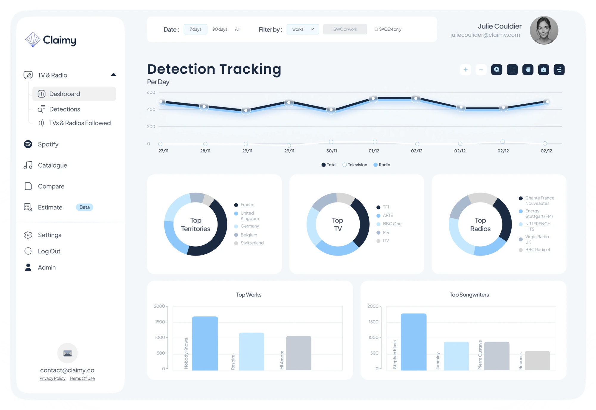- Dashboard and Forecasting Tools: Claimy provides rightsholders with insights on where and when their works were played, along with revenue forecasting capabilities. The platform offers real-time dashboard access showing catalog exploitation, making the traditionally opaque process of royalty collection transparent and actionable.