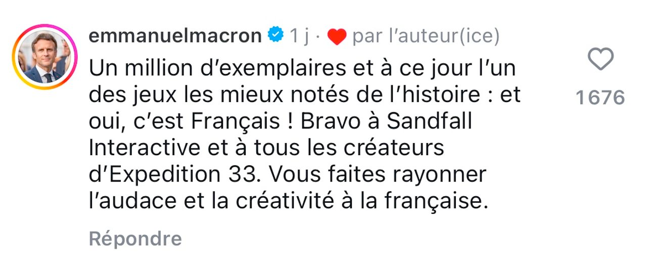 In May 2025, President Emmanuel Macron publicly praised Sandfall on social media, describing the team as "a shining example of French audacity and creativity" and recognizing how the game "highlighted French-style boldness and creativity."