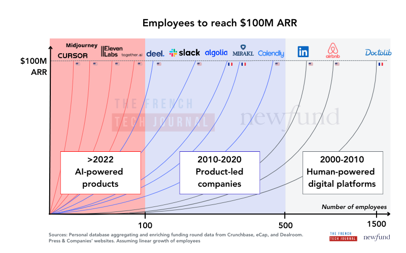 How are French founders reacting to this trend? We were discussing this recently with Mathias Frachon, co-founder of The Product Crew, a French recruitment agency. He told me: “France is merely following the US trend with a time lag; I don't see any fundamental difference. The majority of founders now want to reach $100M ARR with a maximum team of 50 people.”