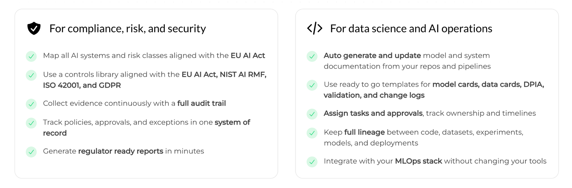 - End-to-End Traceability: From datasets to deployments, enabling auditability.