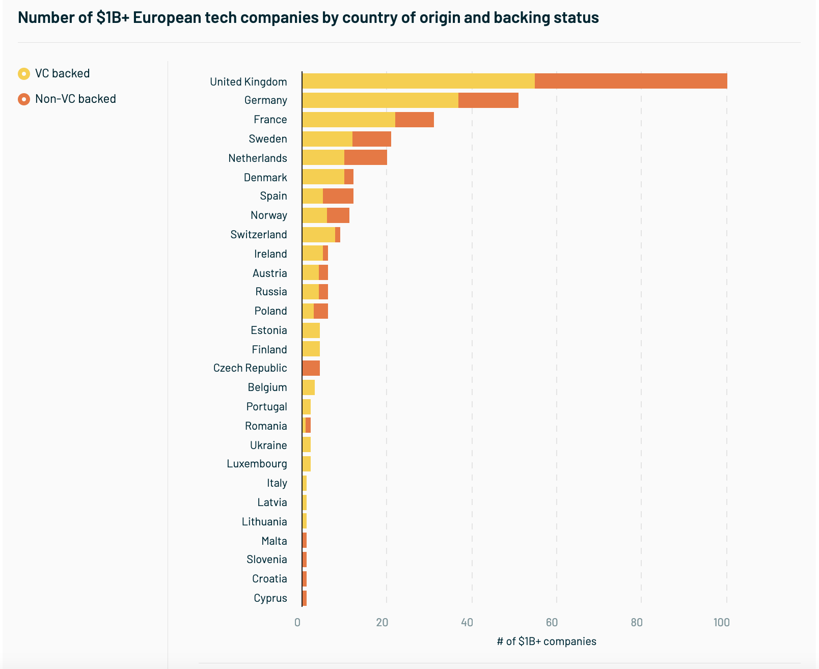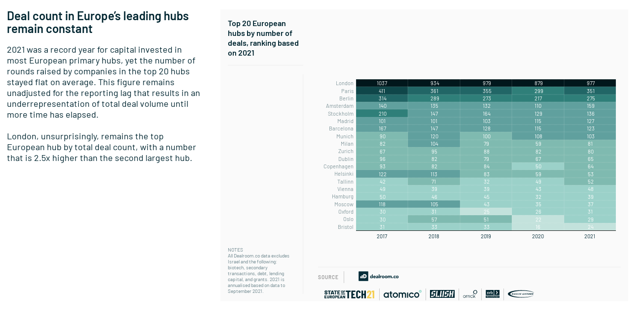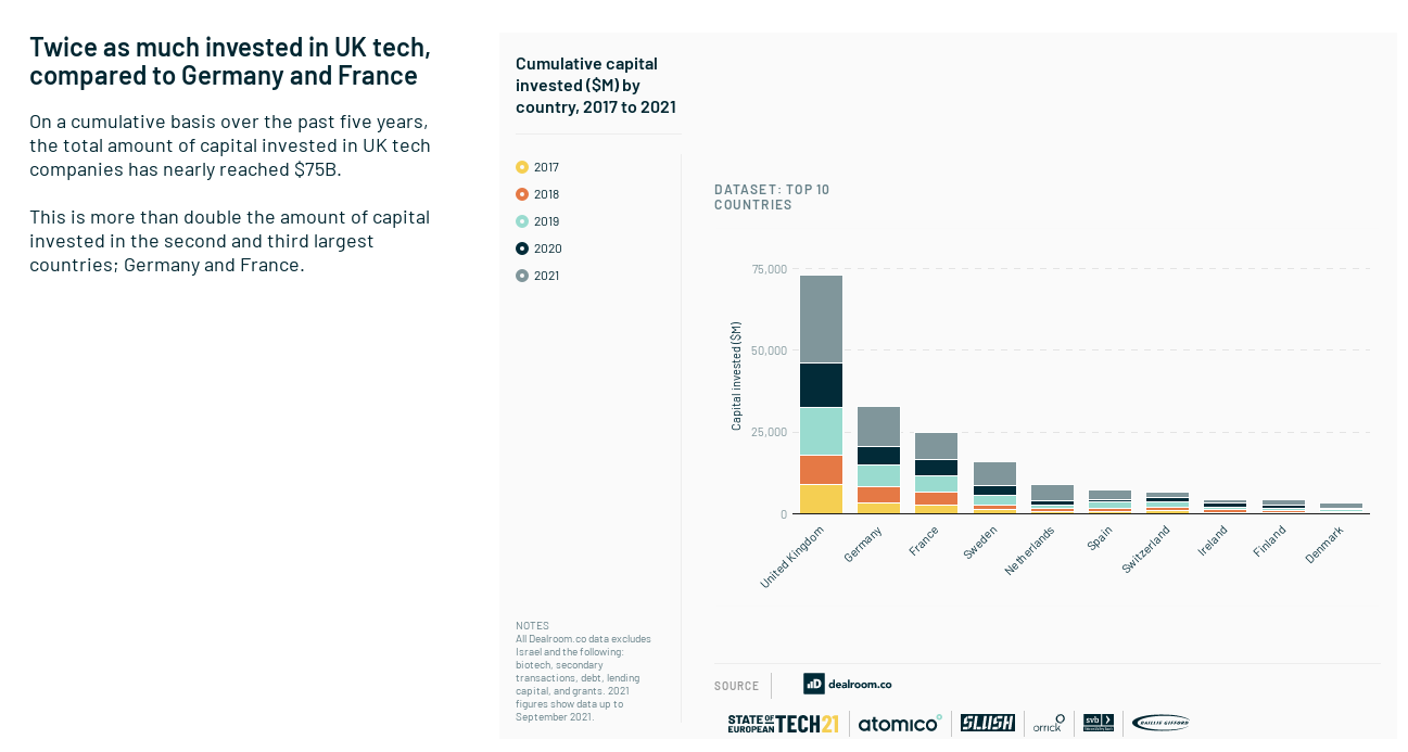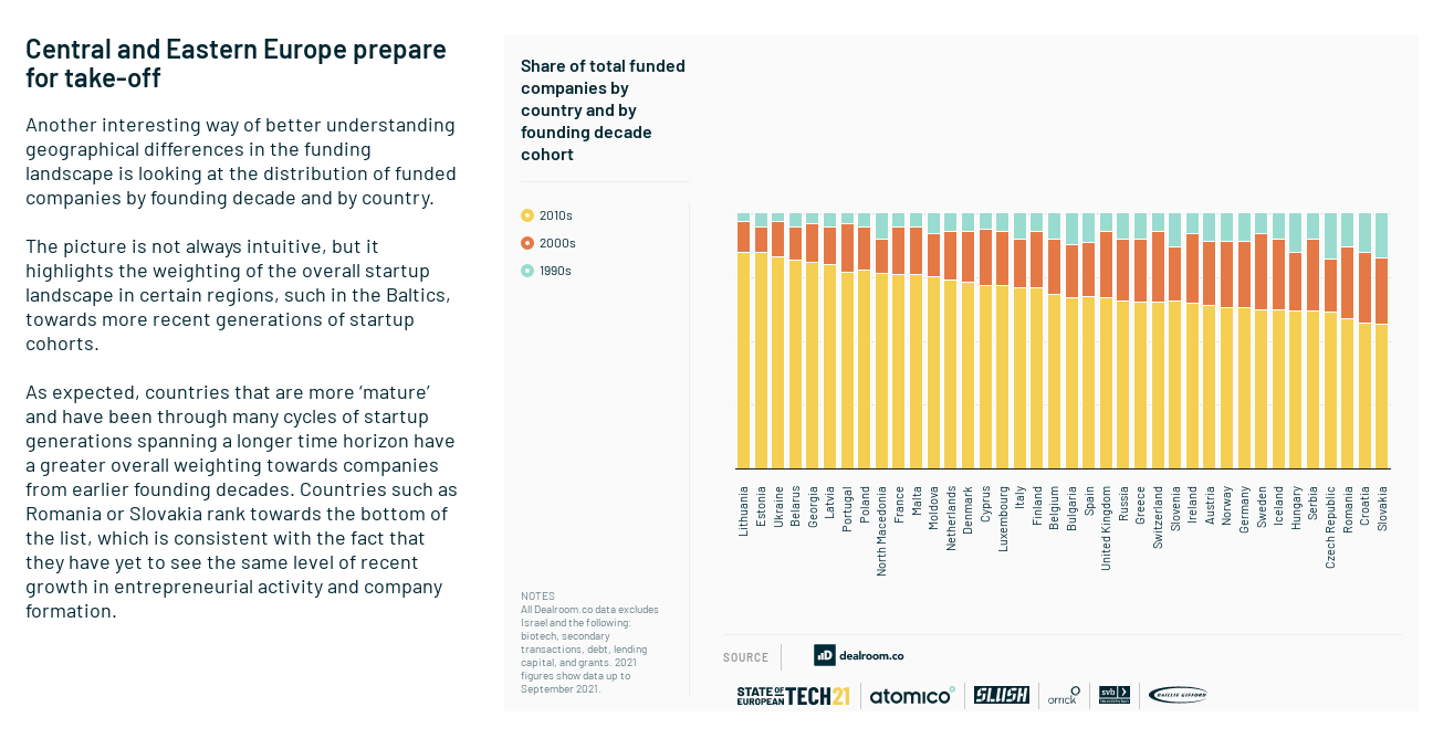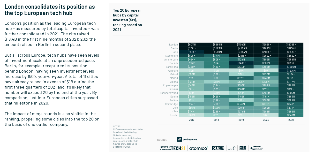 While quick takeaways can be hard to find, this year provides the inescapable bottom line that the European Tech ecosystem is on fire. Even if one didn't need a report to know that, this puts the data around the seismic shift felt across the continent in 2021. With 98 new unicorns minted in 2021 (so far), there is plenty of reason to celebrate the rise of an ecosystem that just a few years ago prompted eye-rolling in Silicon Valley.