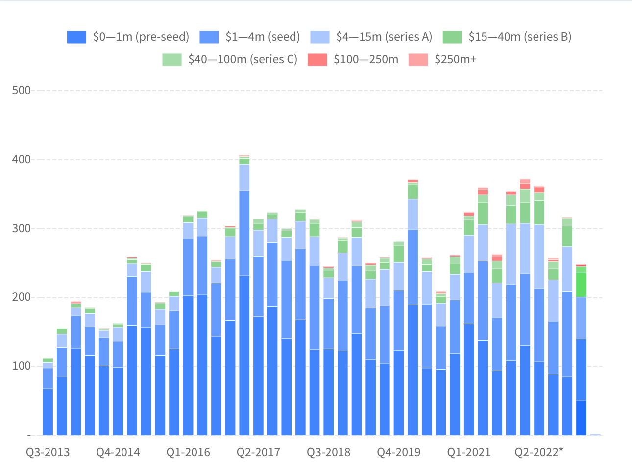 While the big funds ran for cover, early-stage funding held up pretty well, particularly at the pre-Seed to Seed to Series A levels. There were 285 funding deals in Q1 2023, down from 336 in Q4 2022, and 402 in Q1 2022.