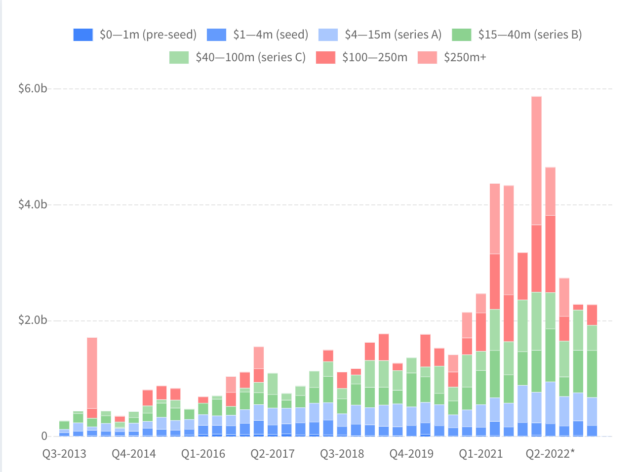 From Q1 2022 to Q1 2023, the number of Seed deals fell from 116 to 99. Not great, but the number of +$100 million rounds fell from 15 to 3 over that same timeframe.