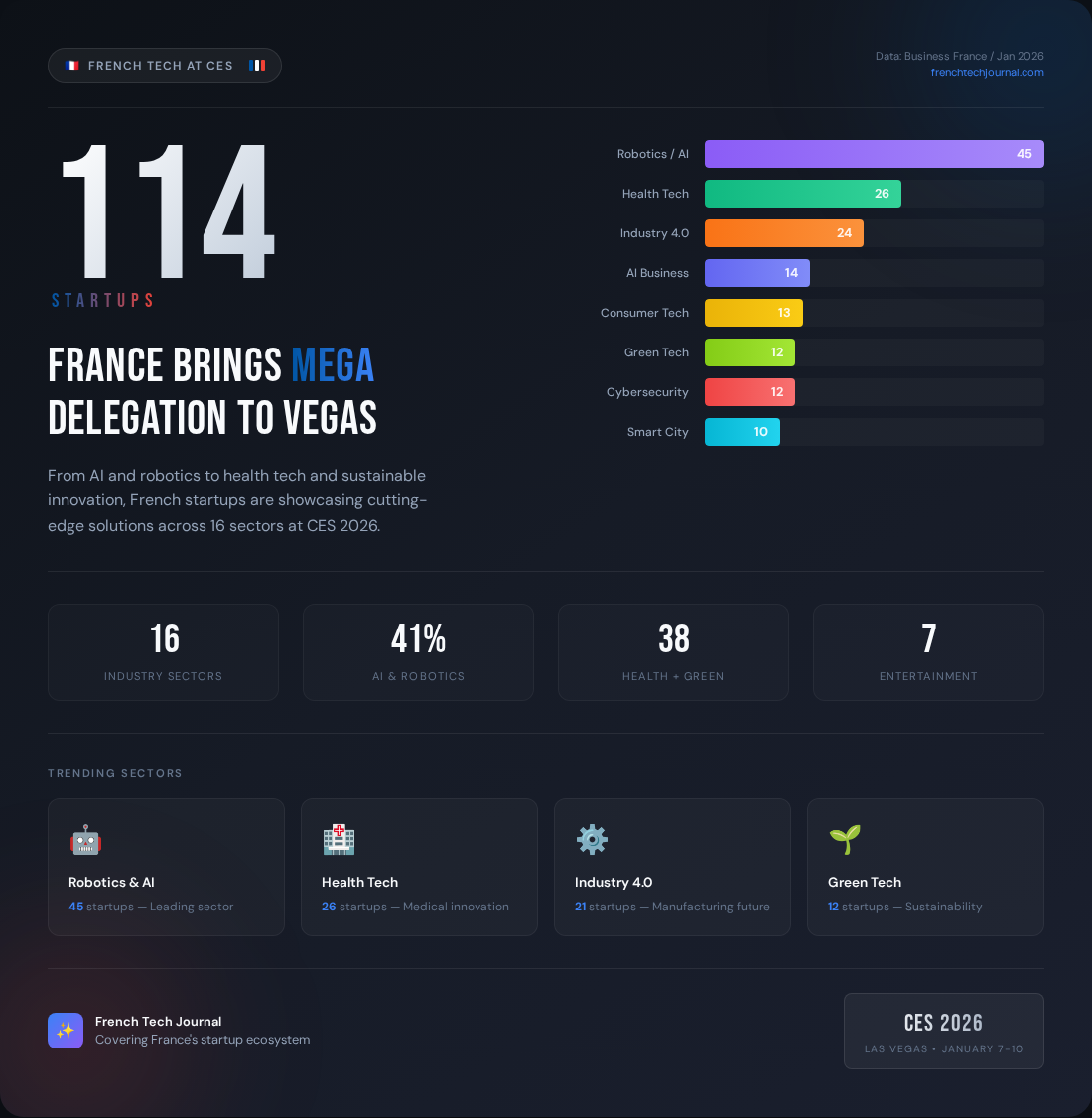France once again sent a major startup delegation to CES 2026 in Las Vegas, with at least 114 French tech companies exhibiting across 16 sectors, from AI and robotics to health and green tech. Despite the high costs, French officials and founders argue that CES remains unmatched for rapid global exposure and deal-making. The delegation is smaller than in pre-pandemic years, down from more than 300 startups in 2018–2019, reflecting tighter funding and a tougher U.S. market. Notably, 80% of the French startups this year were CES veterans, signaling a strategic shift toward experienced companies with market-ready products. Even so, France retains the largest national presence at CES in Europe, split mainly between Eureka Park and the France Automotive Pavilion.