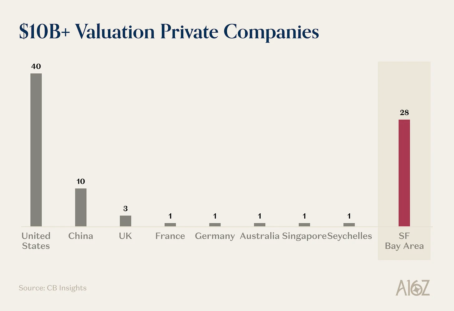 Drawing on CB Insights data, the VC firm notes that almost "every private company with a valuation over ten billion dollars is based either in the United States or in China...There are more of them in the Bay Area than in China and Europe combined."