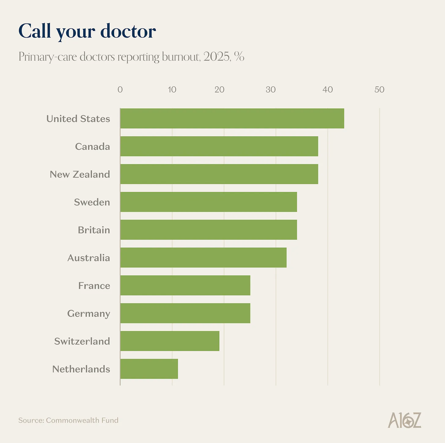 On the other hand, another a16z chart points out that "more than 40 percent of U.S. doctors are reporting burnout. The U.S. is the global leader in doctor burnout." Oh? "Why are American doctors so burnt out? Perhaps because of how bureaucratic American medicine is. A huge amount of doctors’ time is devoted to administrative paperwork that has very little to do with curing patients." Oh?