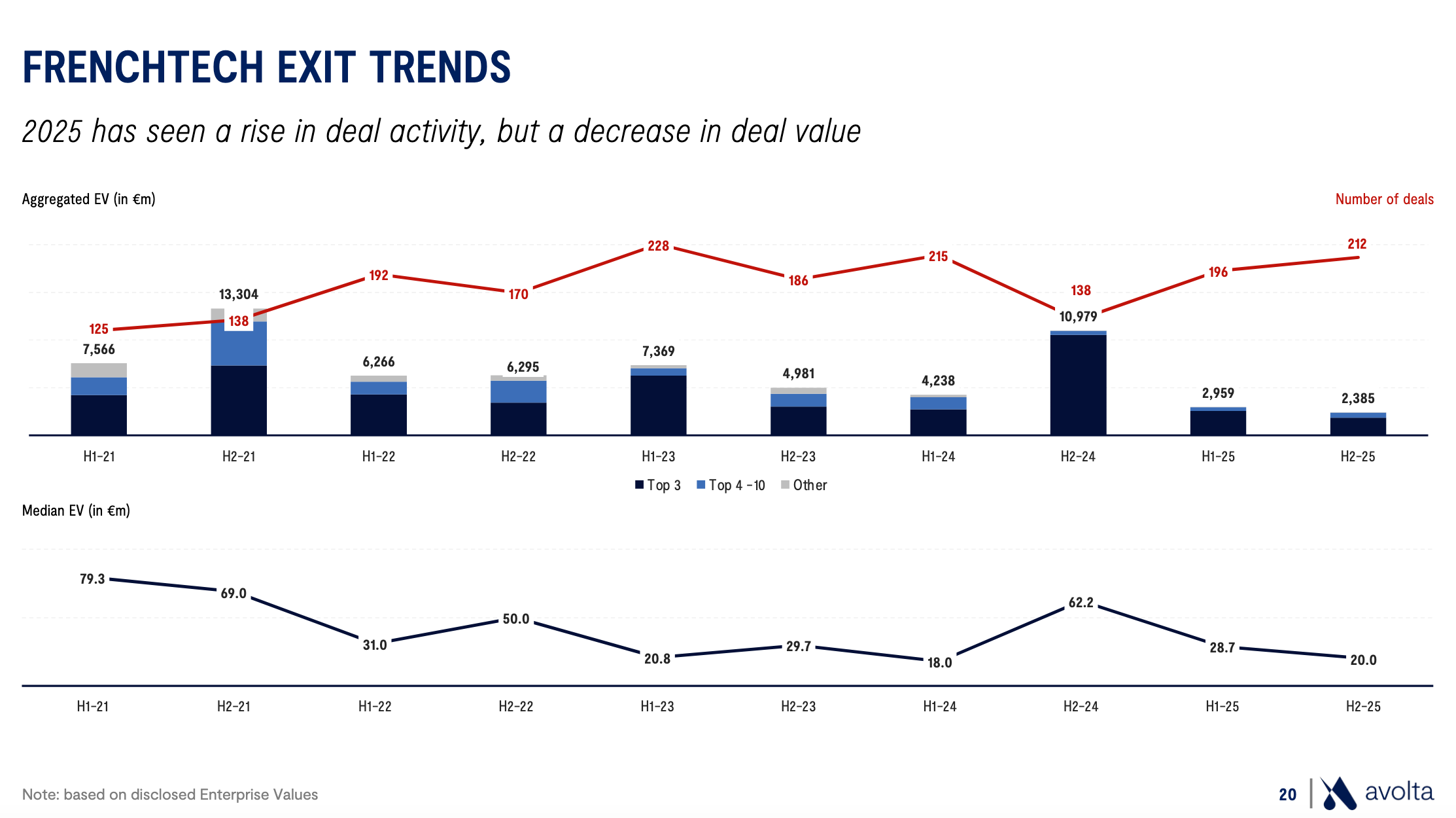 When it comes to exit, France is still playing small ball. Most exits are valued below €50m. International acquirers are capturing 80% of the exit value and 40% of exit volume, according to Avolta. Strategic acquisitions are the most common exits.