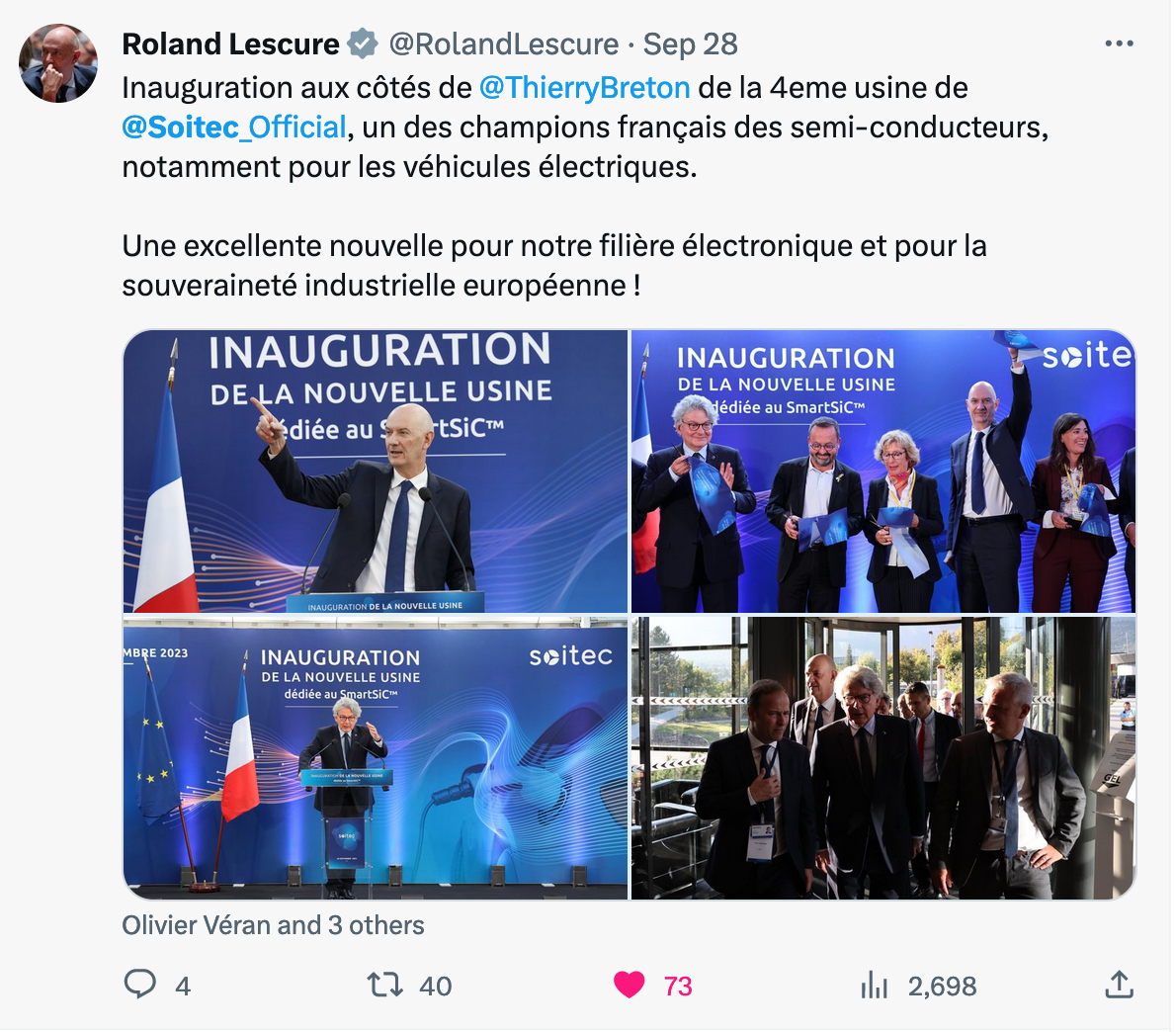 🏭 ⬆️ Soitec: The company officially opened its 4th factory in a ceremony packed full of big names such as Thierry Breton, European Commissioner for the Internal Market, and Roland Lescure, France's Minister of Industry. Based in Grenoble, Soitec designs and produces innovative semiconductor materials that are used for advanced electronic devices, such as smartphone chips, and components for power electronics and photonic devices. The new factory cost: €400m. Politicos hailed the project as another step in the strategy of developing a sovereign microelectronics sector which calls for doubling national production capacities in electronic components by 2026-2027.