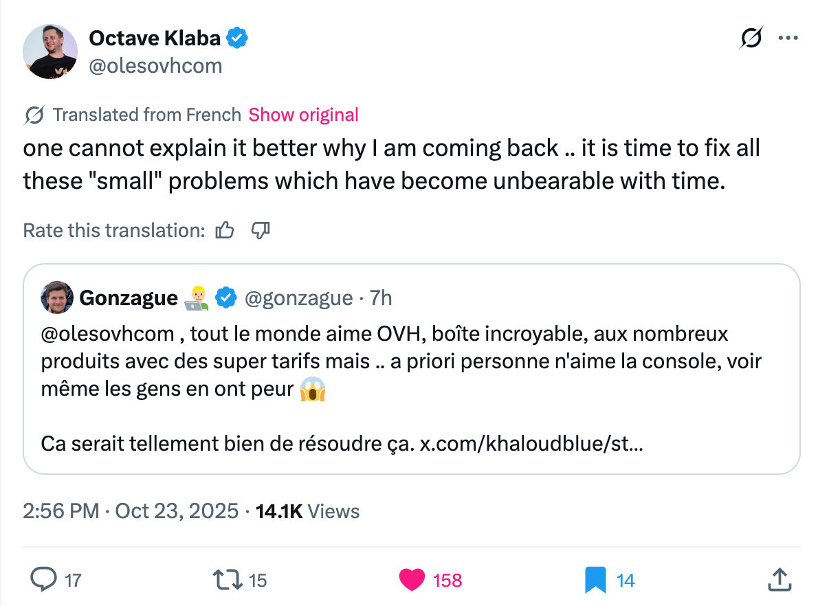 ☁️ 🇪🇺 Cloud pioneer Octave Klaba is back in the pilot’s seat at OVHcloud, reclaiming the CEO role he left seven years ago after the brief tenure of Benjamin Revcolevschi. Klaba wasn't overly specific about the reasons for his return, though on Twitter/X/Whatever he expressed frustration that lots of little things had started to become sub-standard: