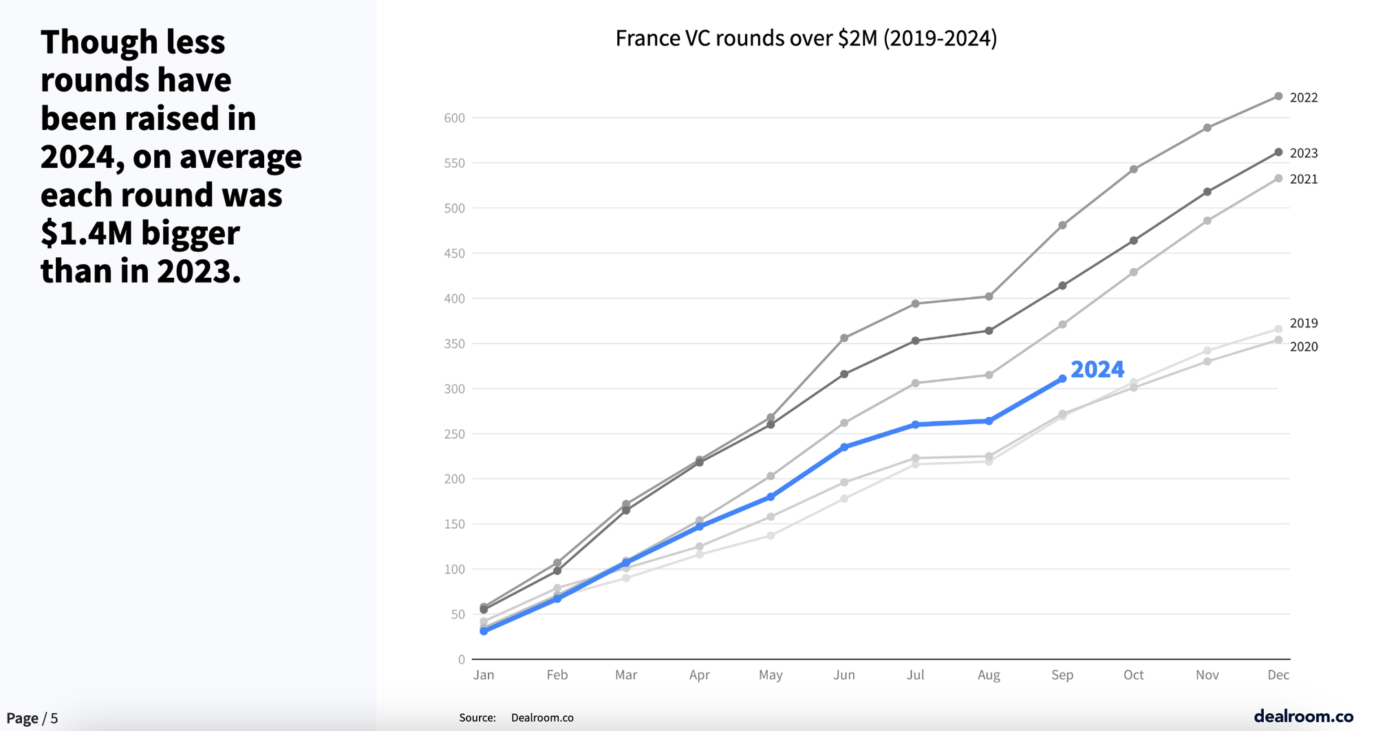 🕺 French startups raised $1.6 billion in Q3 2024, across 147 rounds, according to Dealroom, down from $2.5 billion for the same quarter one year ago. Overall, VC funding for 2024 is ahead of 2019 and 2020 but behind 2023. 😓