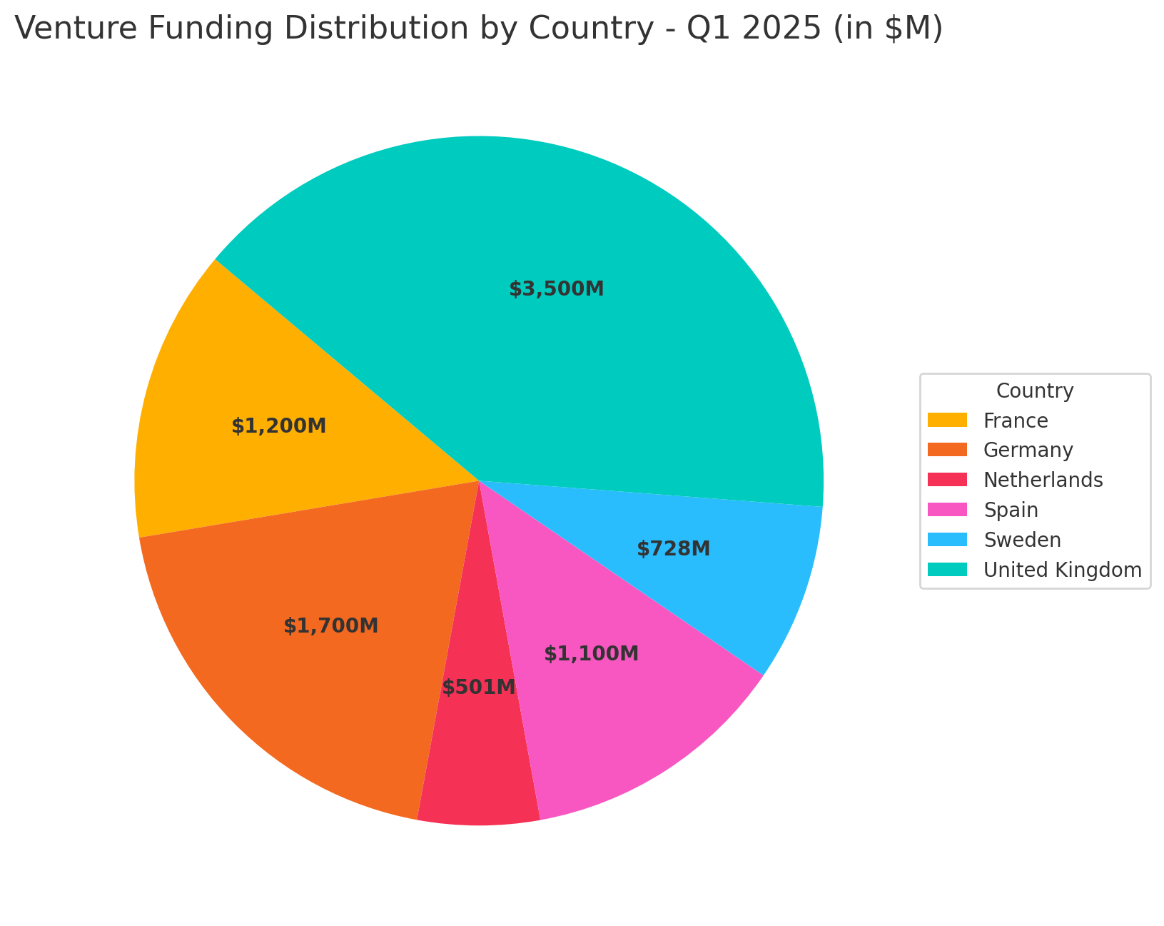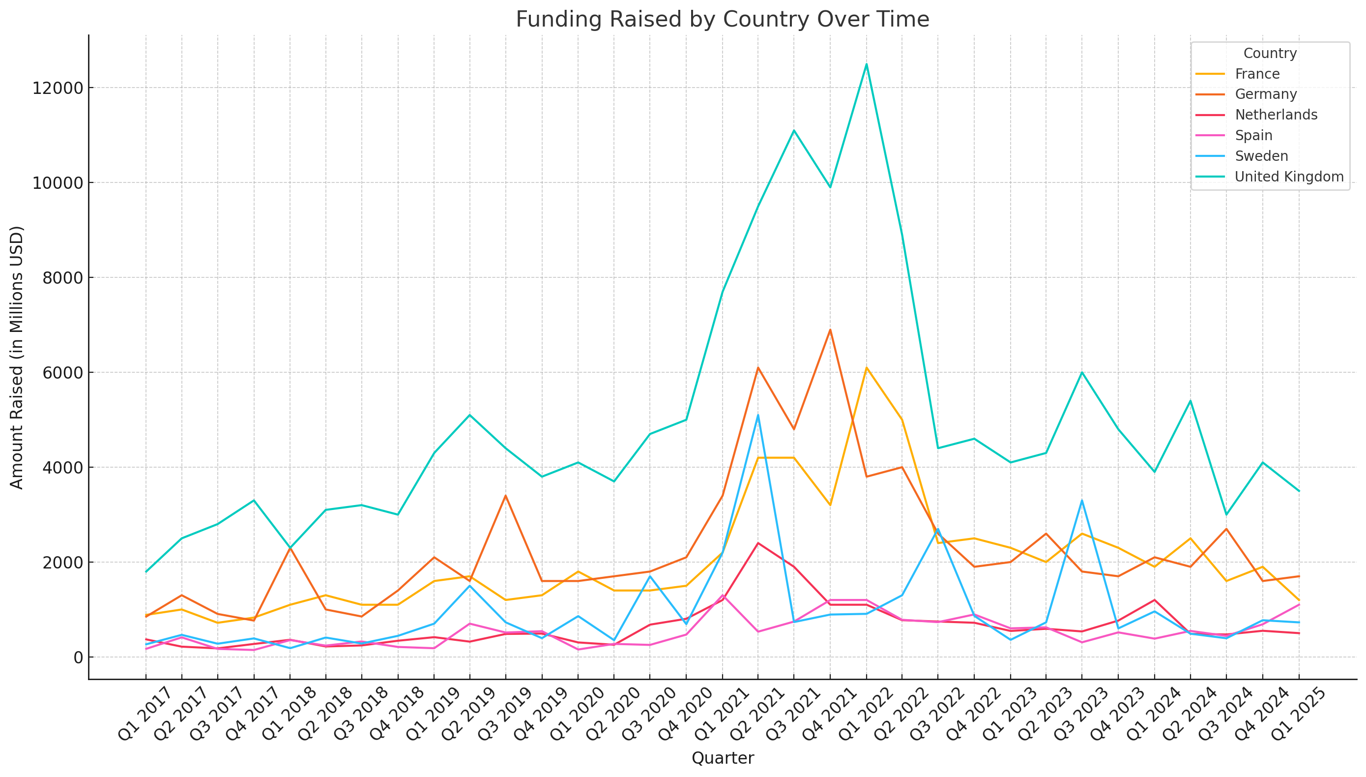 The good news – such as it is – is that France is certainly not isolated. Germany, for example, also saw a dip, but its Q1 2025 funding came in at $1.7 billion, relatively steady compared to $2.1 billion in Q1 2024. The Netherlands, while smaller in absolute terms, raised $501 million, down from $1.2 billion a year earlier.