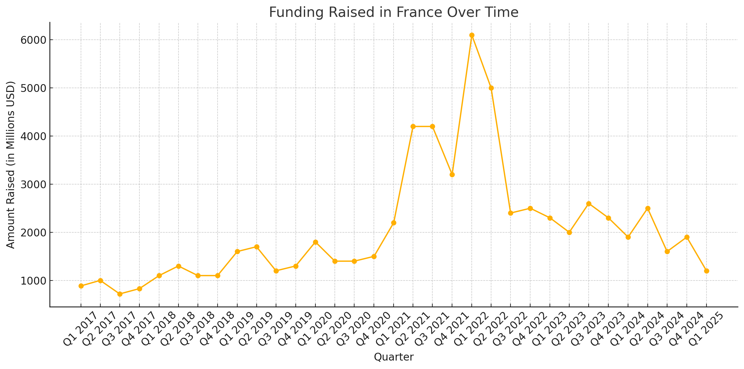 As Q1 2025 winds down, French startups have raised a mere $1.2 billion – the most anemic single quarter since Q3 2019. That amount puts France on pace to raise $4.8 billion in 2025, which would be well off the pace of the $7.9 billion raised in 2024 — which was well off the pace of the $9.2 billion raised in 2023 – which was well off the pace...well, you get the picture. Funding peaked in 2022 with $16 billion, and since then has been in free fall.