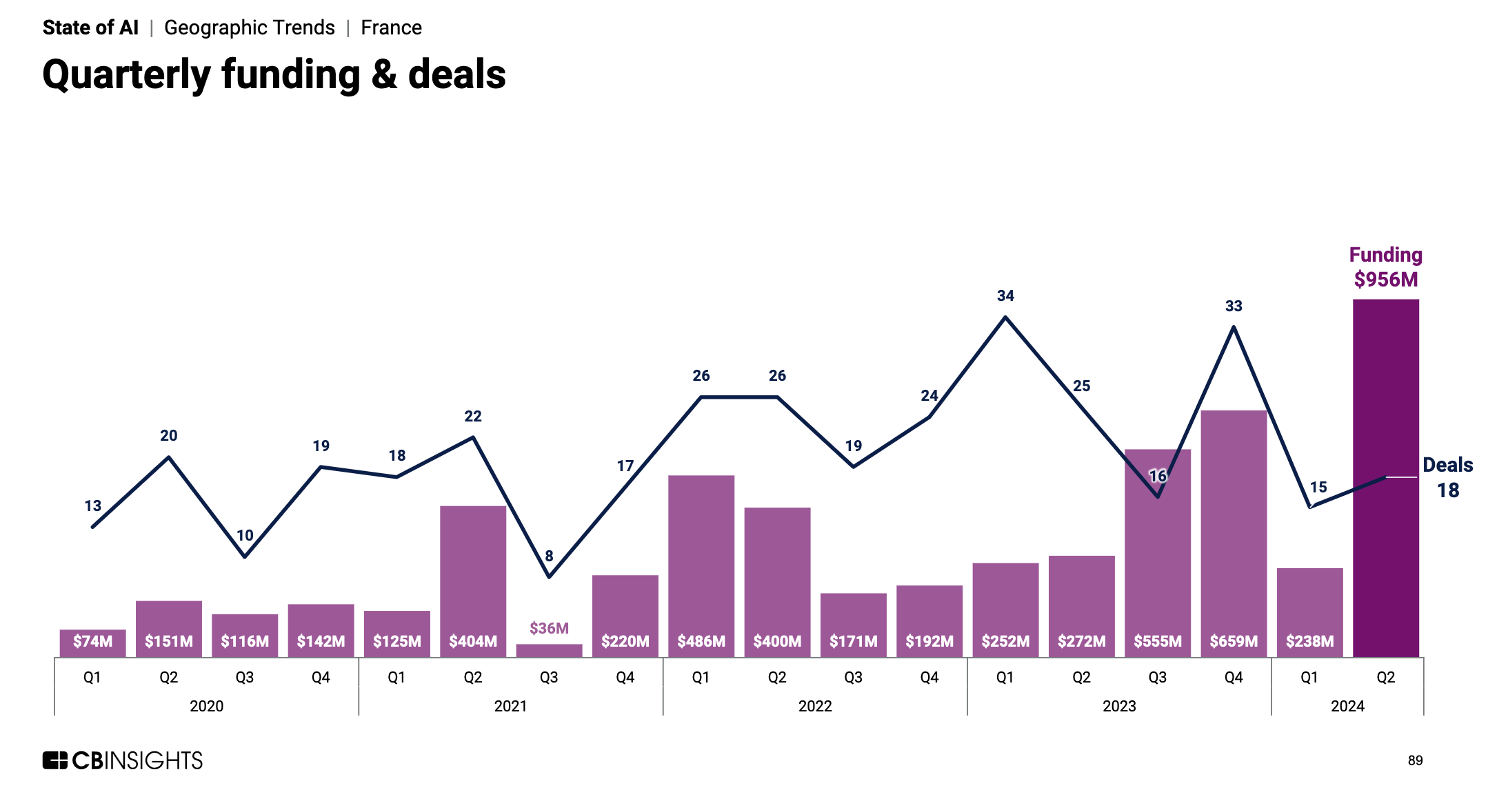 As is the case around the globe, the AI numbers are driven by a few big rounds. According to CB Insight, the top equity deals in Q2 2024 for France: