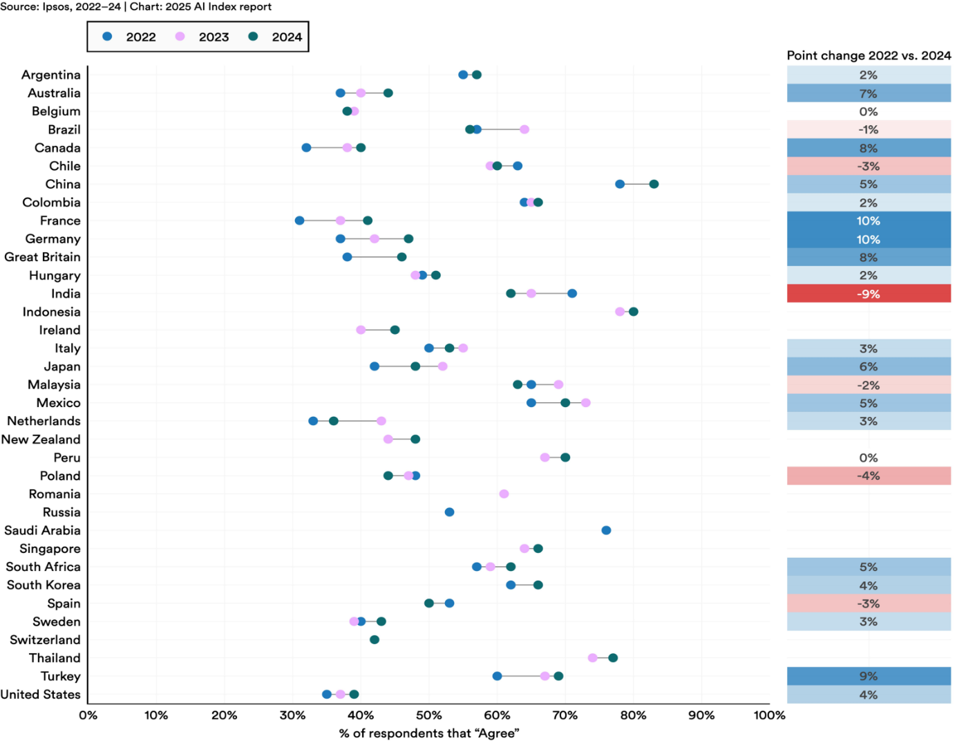🗞️ In the 9th annual AI Index Report 2025 from the Stanford Institute for Human-Centered AI (HAL), France got several high marks – as well as some warning signs. On the good side of the ledger, France produced 3 notable AI models in 2024 — the highest in Europe after the UK and Germany. The French government announced a massive €109 billion investment in AI infrastructure, placing it among the top global investors. France is also joining the global push for safer AI, launching a national AI Safety Institute in 2024. However, industrial robot adoption slowed, with a 13% drop in installations last year. Public AI procurement in France has been steady but modest over the past decade, with ARCOM using AI to regulate digital content and fight online piracy. Finally, the country saw an increase in AI optimism among the general population 10% to 41%. That actually exceeds 39% in the US, but lags dramatically behind the 83% in China.