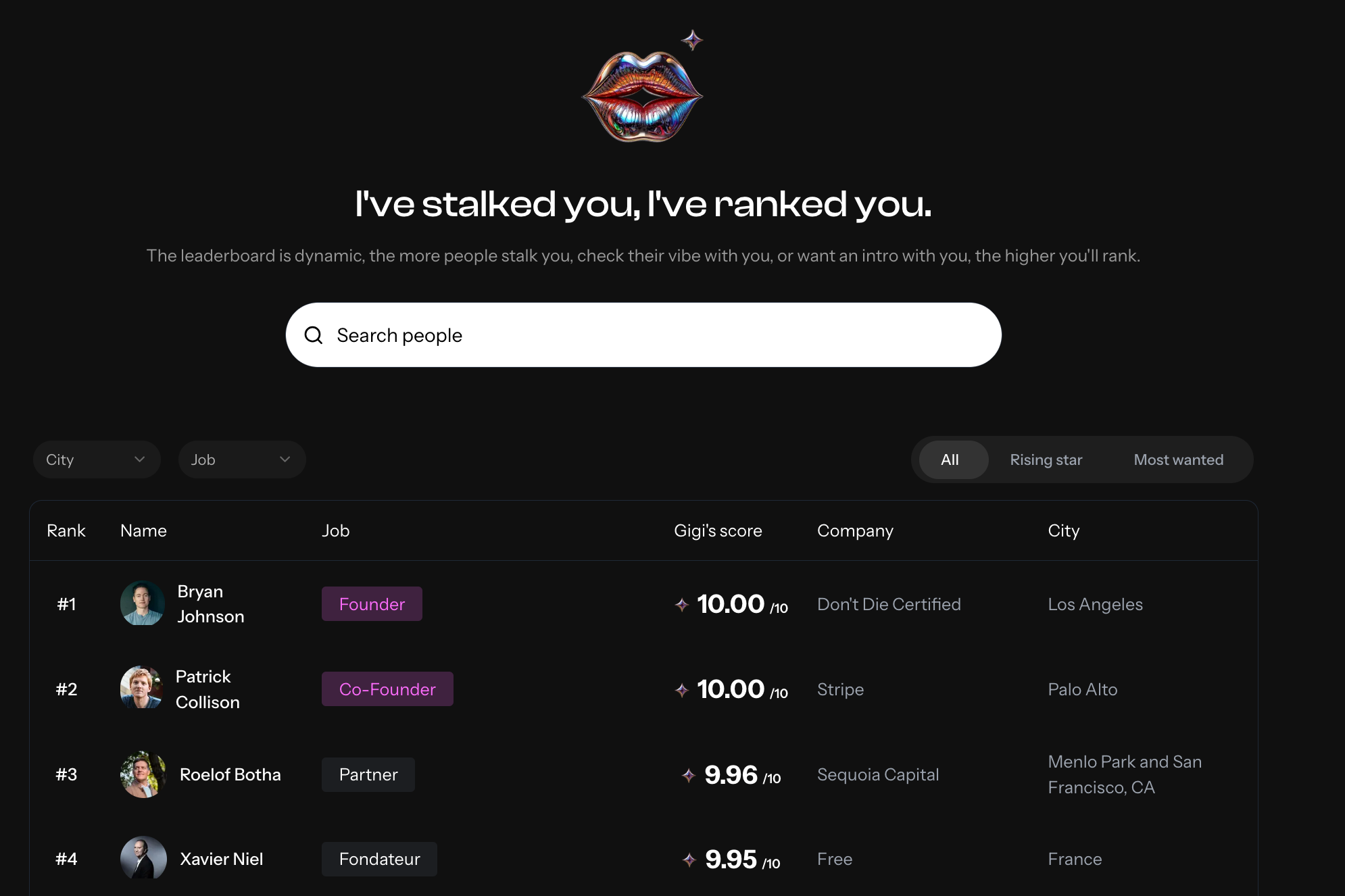 "She scraped your online life, psychoanalyzed you, and now she’s telling you who you should actually meet. You didn’t sign up. You already have a profile. You already have a ranking. You can run a vibe check on anyone. People you like. People you hate. No app. No feed. Just the AI who knows everyone. Obviously, we started with you: the tech crowd. Because let’s be honest, you all secretly want to match with each other anyway."