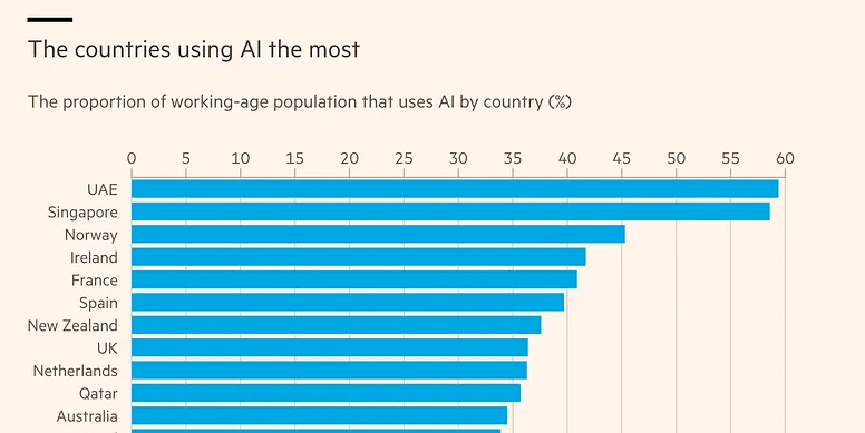 🗞️ We're number cinq! Whatever the nation's rep may be for being stuck it the past, the good folks at the Financial Times and the AI for Good Lab - Microsoft research, France ranks 5th in terms of the percentage of working adults who use AI, at just over 40%. | Financial Times