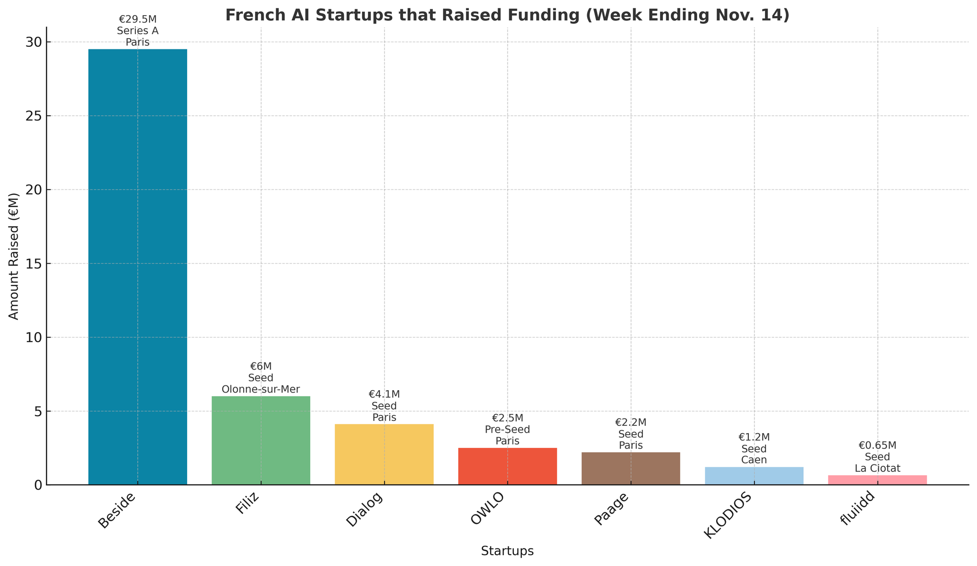 For the week ending November 14, there were 7 AI startups that raised a total of €46.15 million.