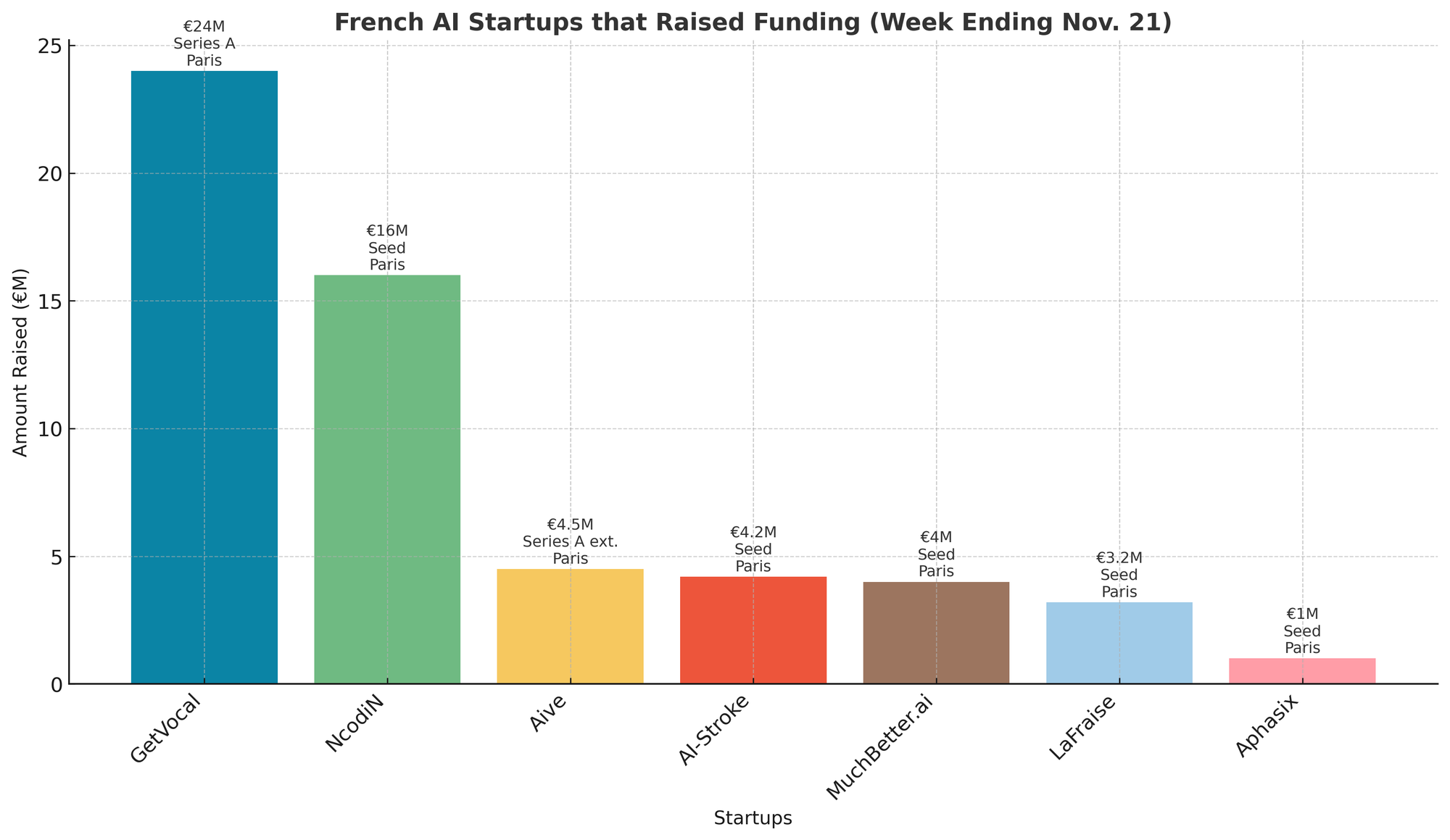 For the week ending November 21, there were 7 AI startups that raised a total of €56.9 million.