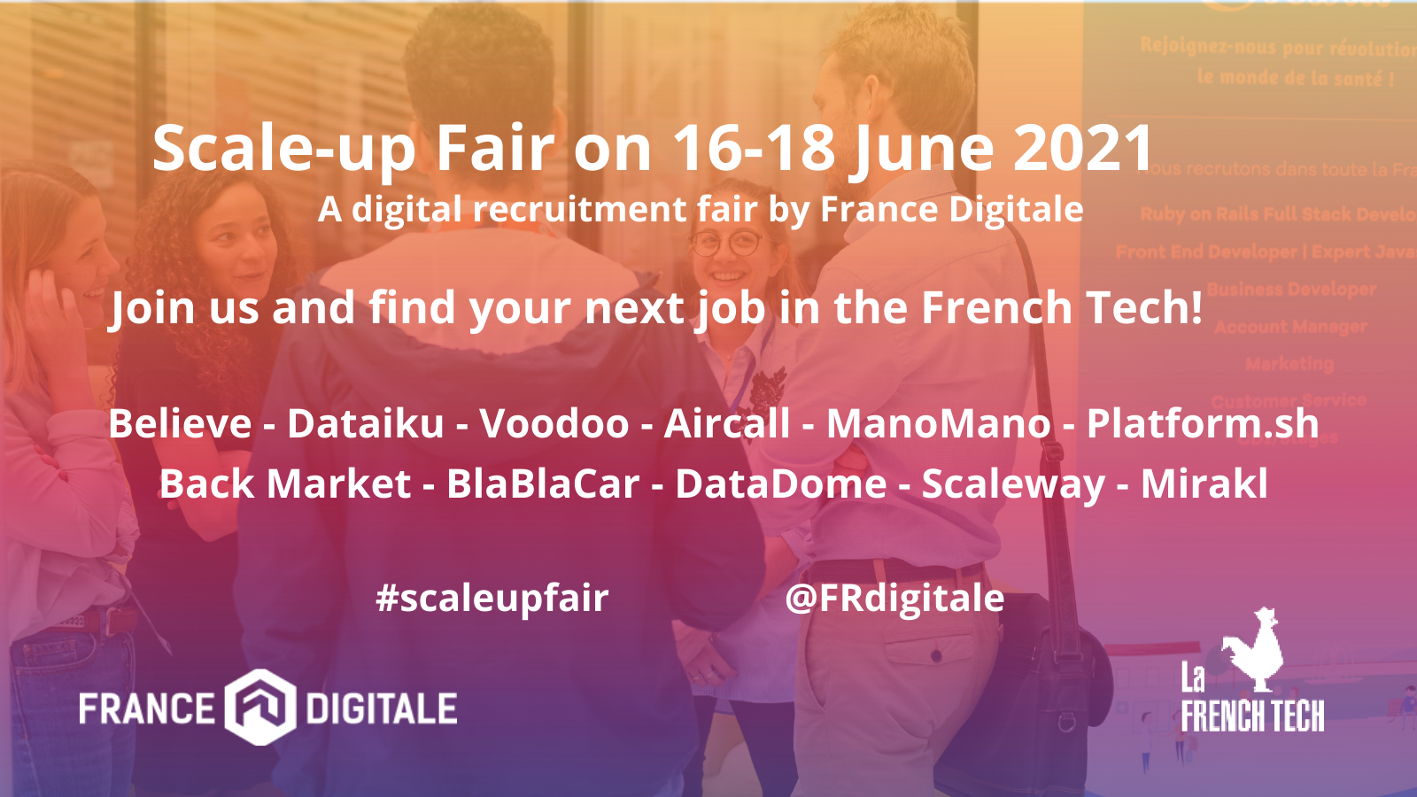 France Digitale is organizing its 4th Scale-up Fair on June 16th-18th as part of Tech Days 2021 and with support from La French Tech. The concept: a recruitment fair organized 100% digitally to showcase the most interesting French scale-ups and match them with engineering and business profiles, starting from students in search for internships all the way to senior profiles. The companies are looking for talent for Tech, Sales, Ops, Product, and Marketing positions, and most of them are in hyper-growth and recruiting actively for all of their offices in and outside of France!