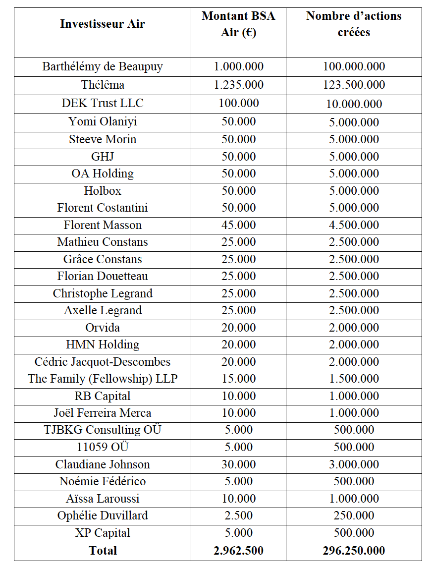 Delaune restructured the business to accept outside investors, and with the help of Ammar raised €2.92 million in October 2021. From a French administrative filling that year, here are the shareholders who invested: