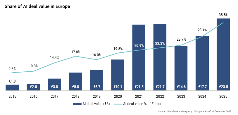 In 2025, 35.5% of European VC deal value was sunk into AI, according to PitchBook. That is predicted to top 50% in 2026. Certainly, the AMI will give that a boost.