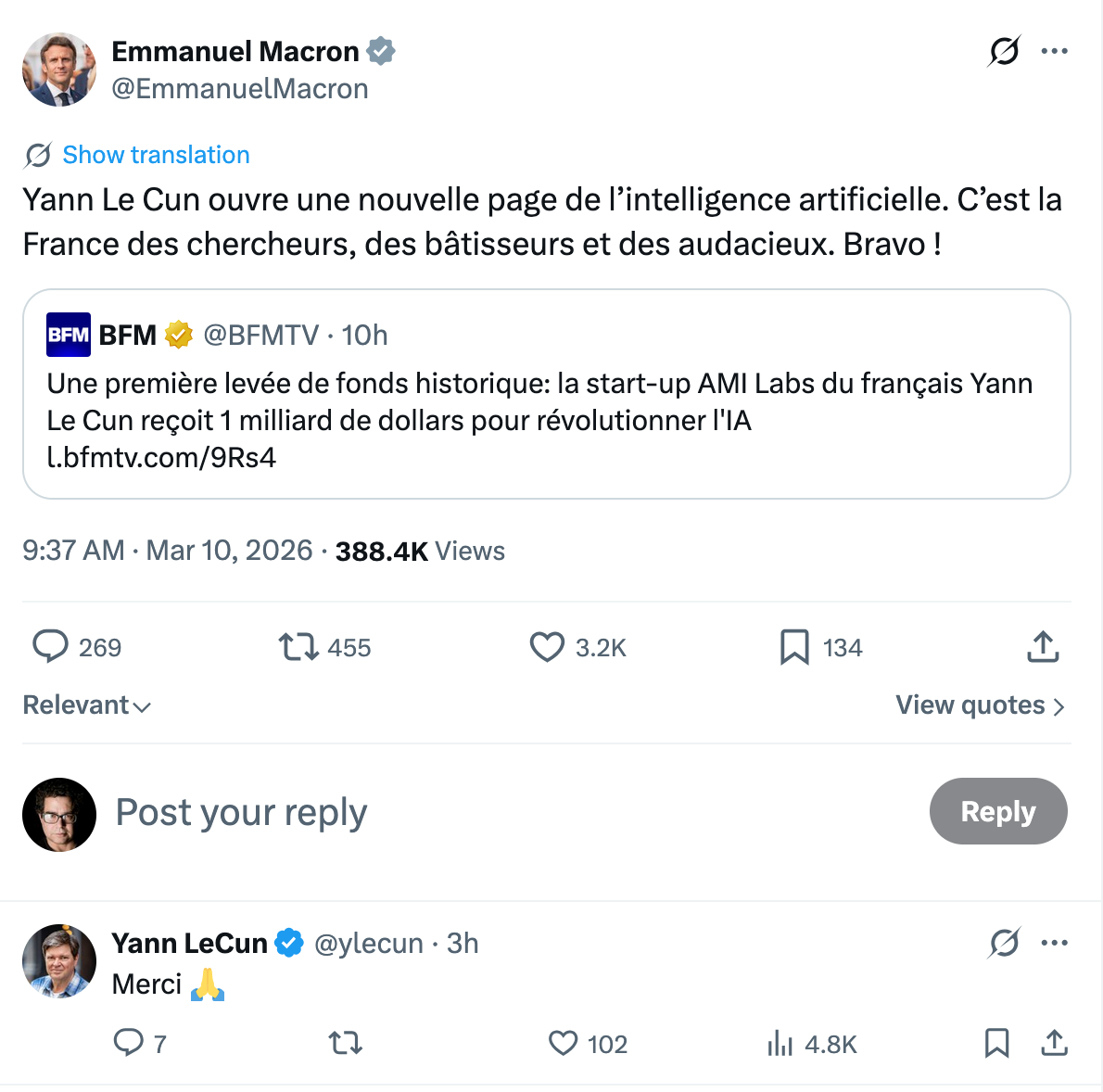 President Emmanuel Macron weighed in with a congratulatory post on X, calling LeCun’s move a testament to “the France of researchers, builders and the bold."